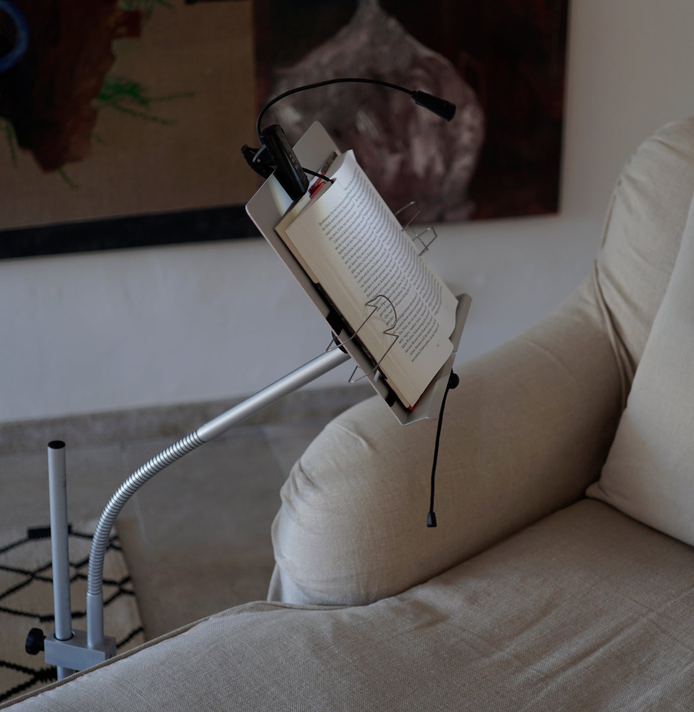 The Easyread reading stand, made of aluminum, stands for clarity, stability, and lasting quality. Crafted from lightweight aluminum, it combines low weight with high strength and a minimalist, functional design. Our book holder, with its flat base, can be easily slid under sofas, armchairs, tables, and beds. The new, even longer gooseneck (68 cm) allows for any reading position. Thanks to its sturdy construction, it is incredibly easy to adjust. Weighing only 4.3 kg, the Easyread reading stand can be easily moved from the sofa to the bed.